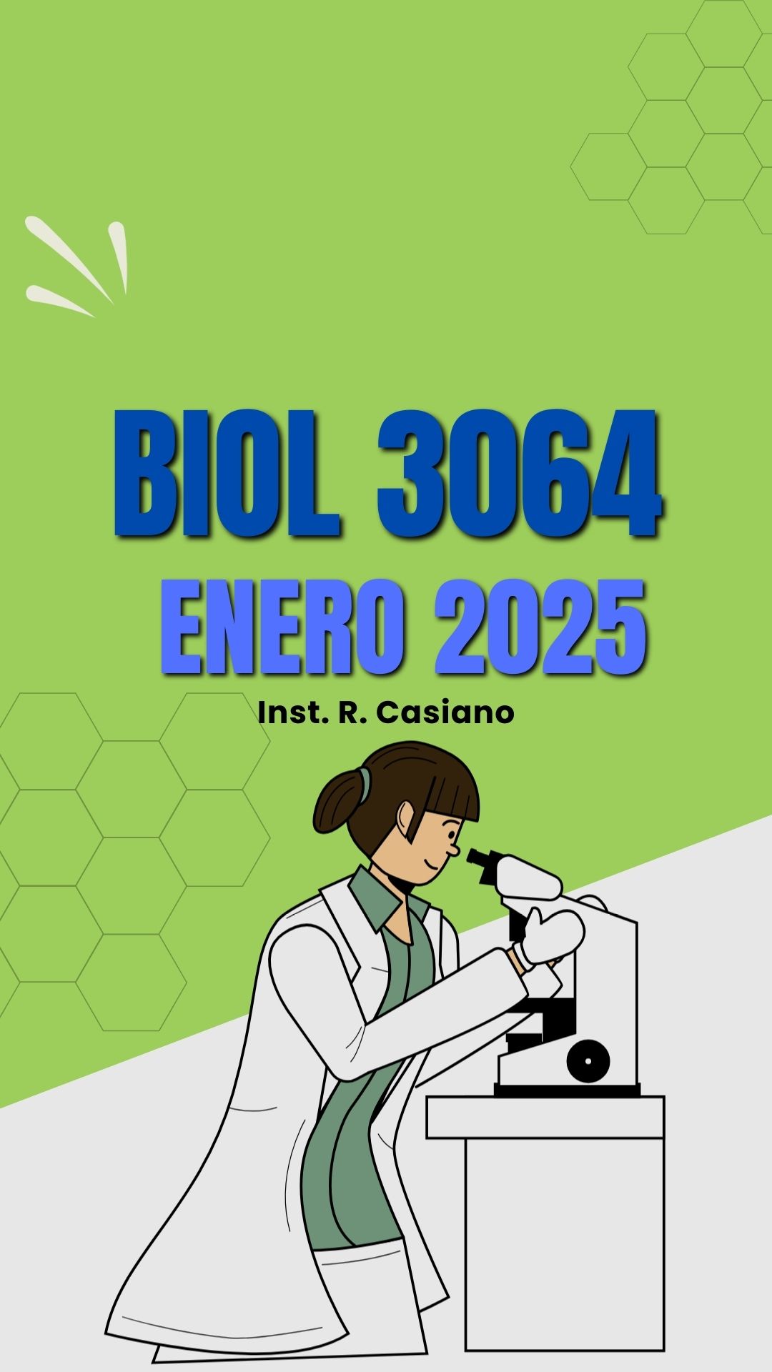 Descripción del laboratorio (español): Este laboratorio es una introducción a los conceptos, tópicos y métodos de la biología general. La primera parte del curso está diseñada para familiarizar al estudiante con los conceptos y destrezas necesarias para llevar a cabo una investigación científica y cómo reportar correctamente los resultados obtenidos en una investigación. La segunda parte discute y familiariza al estudiante con las células, sus componentes celulares y los procesos básicos que realizan las mismas para su óptimo funcionamiento. La tercera parte discute los procesos que realiza la célula que afectan el desarrollo completo del ser vivo y cuáles son los procesos envueltos en la perpetuación de la vida.